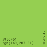 Цвет #95CF51 в цветовой модели RGB обозначается тремя октетами (149, 207, 81) в десятичном формате и #95CF51 в шестнадцатиричном (hex) формате, которые являются интенсивностью красного 149 (hex 95), интенсивность зелёного 207 (hex CF) и интенсивность синего 81 (hex 51).