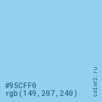 Цвет #95CFF0 в цветовой модели RGB обозначается тремя октетами (149, 207, 240) в десятичном формате и #95CFF0 в шестнадцатиричном (hex) формате, которые являются интенсивностью красного 149 (hex 95), интенсивность зелёного 207 (hex CF) и интенсивность синего 240 (hex F0).