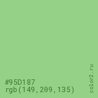 Цвет #95D187 в цветовой модели RGB обозначается тремя октетами (149, 209, 135) в десятичном формате и #95D187 в шестнадцатиричном (hex) формате, которые являются интенсивностью красного 149 (hex 95), интенсивность зелёного 209 (hex D1) и интенсивность синего 135 (hex 87).