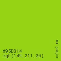 Цвет #95D314 в цветовой модели RGB обозначается тремя октетами (149, 211, 20) в десятичном формате и #95D314 в шестнадцатиричном (hex) формате, которые являются интенсивностью красного 149 (hex 95), интенсивность зелёного 211 (hex D3) и интенсивность синего 20 (hex 14).