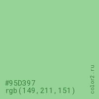 Цвет #95D397 в цветовой модели RGB обозначается тремя октетами (149, 211, 151) в десятичном формате и #95D397 в шестнадцатиричном (hex) формате, которые являются интенсивностью красного 149 (hex 95), интенсивность зелёного 211 (hex D3) и интенсивность синего 151 (hex 97).