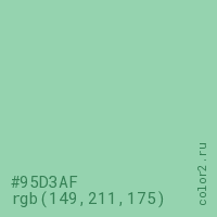 Цвет #95D3AF в цветовой модели RGB обозначается тремя октетами (149, 211, 175) в десятичном формате и #95D3AF в шестнадцатиричном (hex) формате, которые являются интенсивностью красного 149 (hex 95), интенсивность зелёного 211 (hex D3) и интенсивность синего 175 (hex AF).