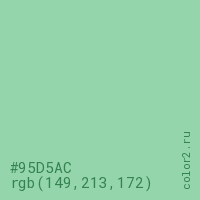 Цвет #95D5AC в цветовой модели RGB обозначается тремя октетами (149, 213, 172) в десятичном формате и #95D5AC в шестнадцатиричном (hex) формате, которые являются интенсивностью красного 149 (hex 95), интенсивность зелёного 213 (hex D5) и интенсивность синего 172 (hex AC).