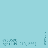 Цвет #95D5DC в цветовой модели RGB обозначается тремя октетами (149, 213, 220) в десятичном формате и #95D5DC в шестнадцатиричном (hex) формате, которые являются интенсивностью красного 149 (hex 95), интенсивность зелёного 213 (hex D5) и интенсивность синего 220 (hex DC).