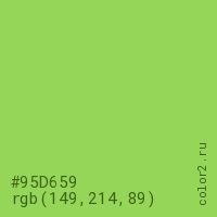 Цвет #95D659 в цветовой модели RGB обозначается тремя октетами (149, 214, 89) в десятичном формате и #95D659 в шестнадцатиричном (hex) формате, которые являются интенсивностью красного 149 (hex 95), интенсивность зелёного 214 (hex D6) и интенсивность синего 89 (hex 59).