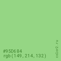 Цвет #95D684 в цветовой модели RGB обозначается тремя октетами (149, 214, 132) в десятичном формате и #95D684 в шестнадцатиричном (hex) формате, которые являются интенсивностью красного 149 (hex 95), интенсивность зелёного 214 (hex D6) и интенсивность синего 132 (hex 84).
