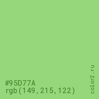 Цвет #95D77A в цветовой модели RGB обозначается тремя октетами (149, 215, 122) в десятичном формате и #95D77A в шестнадцатиричном (hex) формате, которые являются интенсивностью красного 149 (hex 95), интенсивность зелёного 215 (hex D7) и интенсивность синего 122 (hex 7A).