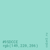 Цвет #95DCCE в цветовой модели RGB обозначается тремя октетами (149, 220, 206) в десятичном формате и #95DCCE в шестнадцатиричном (hex) формате, которые являются интенсивностью красного 149 (hex 95), интенсивность зелёного 220 (hex DC) и интенсивность синего 206 (hex CE).
