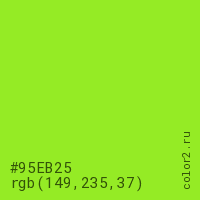 Цвет #95EB25 в цветовой модели RGB обозначается тремя октетами (149, 235, 37) в десятичном формате и #95EB25 в шестнадцатиричном (hex) формате, которые являются интенсивностью красного 149 (hex 95), интенсивность зелёного 235 (hex EB) и интенсивность синего 37 (hex 25).