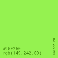 Цвет RGB(149, 242, 80) в процентом отношении количества цвета состоит из 58.4% красного (red), 94.9% зелёного (green) и 31.4% синего (blue).