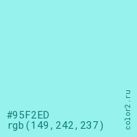 Цвет #95F2ED в цветовой модели RGB обозначается тремя октетами (149, 242, 237) в десятичном формате и #95F2ED в шестнадцатиричном (hex) формате, которые являются интенсивностью красного 149 (hex 95), интенсивность зелёного 242 (hex F2) и интенсивность синего 237 (hex ED).