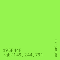 Цвет #95F44F в цветовой модели RGB обозначается тремя октетами (149, 244, 79) в десятичном формате и #95F44F в шестнадцатиричном (hex) формате, которые являются интенсивностью красного 149 (hex 95), интенсивность зелёного 244 (hex F4) и интенсивность синего 79 (hex 4F).