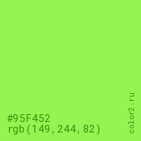 Цвет #95F452 в цветовой модели RGB обозначается тремя октетами (149, 244, 82) в десятичном формате и #95F452 в шестнадцатиричном (hex) формате, которые являются интенсивностью красного 149 (hex 95), интенсивность зелёного 244 (hex F4) и интенсивность синего 82 (hex 52).