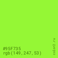 Цвет #95F735 в цветовой модели RGB обозначается тремя октетами (149, 247, 53) в десятичном формате и #95F735 в шестнадцатиричном (hex) формате, которые являются интенсивностью красного 149 (hex 95), интенсивность зелёного 247 (hex F7) и интенсивность синего 53 (hex 35).