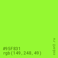 Цвет #95F831 в цветовой модели RGB обозначается тремя октетами (149, 248, 49) в десятичном формате и #95F831 в шестнадцатиричном (hex) формате, которые являются интенсивностью красного 149 (hex 95), интенсивность зелёного 248 (hex F8) и интенсивность синего 49 (hex 31).