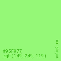 Цвет #95F977 в цветовой модели RGB обозначается тремя октетами (149, 249, 119) в десятичном формате и #95F977 в шестнадцатиричном (hex) формате, которые являются интенсивностью красного 149 (hex 95), интенсивность зелёного 249 (hex F9) и интенсивность синего 119 (hex 77).