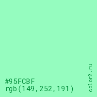 Цвет #95FCBF в цветовой модели RGB обозначается тремя октетами (149, 252, 191) в десятичном формате и #95FCBF в шестнадцатиричном (hex) формате, которые являются интенсивностью красного 149 (hex 95), интенсивность зелёного 252 (hex FC) и интенсивность синего 191 (hex BF).