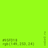 Цвет #95FD18 в цветовой модели RGB обозначается тремя октетами (149, 253, 24) в десятичном формате и #95FD18 в шестнадцатиричном (hex) формате, которые являются интенсивностью красного 149 (hex 95), интенсивность зелёного 253 (hex FD) и интенсивность синего 24 (hex 18).