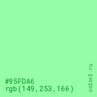 Цвет #95FDA6 в цветовой модели RGB обозначается тремя октетами (149, 253, 166) в десятичном формате и #95FDA6 в шестнадцатиричном (hex) формате, которые являются интенсивностью красного 149 (hex 95), интенсивность зелёного 253 (hex FD) и интенсивность синего 166 (hex A6).