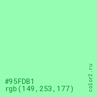 Цвет #95FDB1 в цветовой модели RGB обозначается тремя октетами (149, 253, 177) в десятичном формате и #95FDB1 в шестнадцатиричном (hex) формате, которые являются интенсивностью красного 149 (hex 95), интенсивность зелёного 253 (hex FD) и интенсивность синего 177 (hex B1).