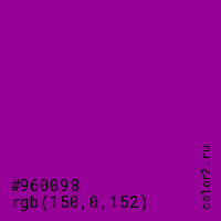 Цвет #960098 в цветовой модели RGB обозначается тремя октетами (150, 0, 152) в десятичном формате и #960098 в шестнадцатиричном (hex) формате, которые являются интенсивностью красного 150 (hex 96), интенсивность зелёного 0 (hex 00) и интенсивность синего 152 (hex 98).