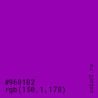 Цвет #9601B2 в цветовой модели RGB обозначается тремя октетами (150, 1, 178) в десятичном формате и #9601B2 в шестнадцатиричном (hex) формате, которые являются интенсивностью красного 150 (hex 96), интенсивность зелёного 1 (hex 01) и интенсивность синего 178 (hex B2).