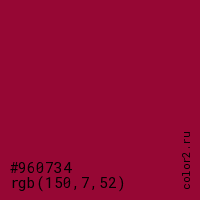 Цвет #960734 в цветовой модели RGB обозначается тремя октетами (150, 7, 52) в десятичном формате и #960734 в шестнадцатиричном (hex) формате, которые являются интенсивностью красного 150 (hex 96), интенсивность зелёного 7 (hex 07) и интенсивность синего 52 (hex 34).