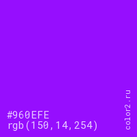 Цвет #960EFE в цветовой модели RGB обозначается тремя октетами (150, 14, 254) в десятичном формате и #960EFE в шестнадцатиричном (hex) формате, которые являются интенсивностью красного 150 (hex 96), интенсивность зелёного 14 (hex 0E) и интенсивность синего 254 (hex FE).