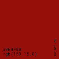 Цвет #960F08 в цветовой модели RGB обозначается тремя октетами (150, 15, 8) в десятичном формате и #960F08 в шестнадцатиричном (hex) формате, которые являются интенсивностью красного 150 (hex 96), интенсивность зелёного 15 (hex 0F) и интенсивность синего 8 (hex 08).