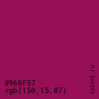 Цвет #960F57 в цветовой модели RGB обозначается тремя октетами (150, 15, 87) в десятичном формате и #960F57 в шестнадцатиричном (hex) формате, которые являются интенсивностью красного 150 (hex 96), интенсивность зелёного 15 (hex 0F) и интенсивность синего 87 (hex 57).