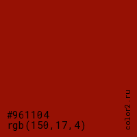 Цвет #961104 в цветовой модели RGB обозначается тремя октетами (150, 17, 4) в десятичном формате и #961104 в шестнадцатиричном (hex) формате, которые являются интенсивностью красного 150 (hex 96), интенсивность зелёного 17 (hex 11) и интенсивность синего 4 (hex 04).