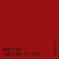 Цвет #96110F в цветовой модели RGB обозначается тремя октетами (150, 17, 15) в десятичном формате и #96110F в шестнадцатиричном (hex) формате, которые являются интенсивностью красного 150 (hex 96), интенсивность зелёного 17 (hex 11) и интенсивность синего 15 (hex 0F).