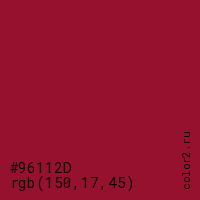 Цвет #96112D в цветовой модели RGB обозначается тремя октетами (150, 17, 45) в десятичном формате и #96112D в шестнадцатиричном (hex) формате, которые являются интенсивностью красного 150 (hex 96), интенсивность зелёного 17 (hex 11) и интенсивность синего 45 (hex 2D).