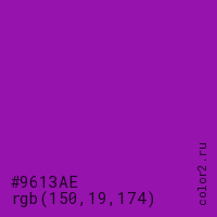 Цвет #9613AE в цветовой модели RGB обозначается тремя октетами (150, 19, 174) в десятичном формате и #9613AE в шестнадцатиричном (hex) формате, которые являются интенсивностью красного 150 (hex 96), интенсивность зелёного 19 (hex 13) и интенсивность синего 174 (hex AE).