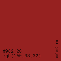 Цвет #962120 в цветовой модели RGB обозначается тремя октетами (150, 33, 32) в десятичном формате и #962120 в шестнадцатиричном (hex) формате, которые являются интенсивностью красного 150 (hex 96), интенсивность зелёного 33 (hex 21) и интенсивность синего 32 (hex 20).
