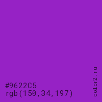 Цвет #9622C5 в цветовой модели RGB обозначается тремя октетами (150, 34, 197) в десятичном формате и #9622C5 в шестнадцатиричном (hex) формате, которые являются интенсивностью красного 150 (hex 96), интенсивность зелёного 34 (hex 22) и интенсивность синего 197 (hex C5).