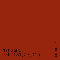 Цвет #96250C в цветовой модели RGB обозначается тремя октетами (150, 37, 12) в десятичном формате и #96250C в шестнадцатиричном (hex) формате, которые являются интенсивностью красного 150 (hex 96), интенсивность зелёного 37 (hex 25) и интенсивность синего 12 (hex 0C).