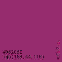 Цвет #962C6E в цветовой модели RGB обозначается тремя октетами (150, 44, 110) в десятичном формате и #962C6E в шестнадцатиричном (hex) формате, которые являются интенсивностью красного 150 (hex 96), интенсивность зелёного 44 (hex 2C) и интенсивность синего 110 (hex 6E).