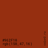 Цвет #962F10 в цветовой модели RGB обозначается тремя октетами (150, 47, 16) в десятичном формате и #962F10 в шестнадцатиричном (hex) формате, которые являются интенсивностью красного 150 (hex 96), интенсивность зелёного 47 (hex 2F) и интенсивность синего 16 (hex 10).