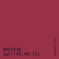 Цвет #96304B в цветовой модели RGB обозначается тремя октетами (150, 48, 75) в десятичном формате и #96304B в шестнадцатиричном (hex) формате, которые являются интенсивностью красного 150 (hex 96), интенсивность зелёного 48 (hex 30) и интенсивность синего 75 (hex 4B).