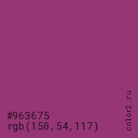 Цвет #963675 в цветовой модели RGB обозначается тремя октетами (150, 54, 117) в десятичном формате и #963675 в шестнадцатиричном (hex) формате, которые являются интенсивностью красного 150 (hex 96), интенсивность зелёного 54 (hex 36) и интенсивность синего 117 (hex 75).