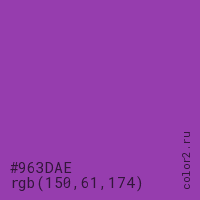 Цвет #963DAE в цветовой модели RGB обозначается тремя октетами (150, 61, 174) в десятичном формате и #963DAE в шестнадцатиричном (hex) формате, которые являются интенсивностью красного 150 (hex 96), интенсивность зелёного 61 (hex 3D) и интенсивность синего 174 (hex AE).