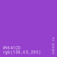 Цвет #9641CD в цветовой модели RGB обозначается тремя октетами (150, 65, 205) в десятичном формате и #9641CD в шестнадцатиричном (hex) формате, которые являются интенсивностью красного 150 (hex 96), интенсивность зелёного 65 (hex 41) и интенсивность синего 205 (hex CD).