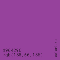 Цвет #96429C в цветовой модели RGB обозначается тремя октетами (150, 66, 156) в десятичном формате и #96429C в шестнадцатиричном (hex) формате, которые являются интенсивностью красного 150 (hex 96), интенсивность зелёного 66 (hex 42) и интенсивность синего 156 (hex 9C).