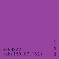 Цвет #9643A2 в цветовой модели RGB обозначается тремя октетами (150, 67, 162) в десятичном формате и #9643A2 в шестнадцатиричном (hex) формате, которые являются интенсивностью красного 150 (hex 96), интенсивность зелёного 67 (hex 43) и интенсивность синего 162 (hex A2).