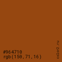 Цвет #964710 в цветовой модели RGB обозначается тремя октетами (150, 71, 16) в десятичном формате и #964710 в шестнадцатиричном (hex) формате, которые являются интенсивностью красного 150 (hex 96), интенсивность зелёного 71 (hex 47) и интенсивность синего 16 (hex 10).