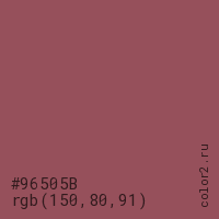 Цвет #96505B в цветовой модели RGB обозначается тремя октетами (150, 80, 91) в десятичном формате и #96505B в шестнадцатиричном (hex) формате, которые являются интенсивностью красного 150 (hex 96), интенсивность зелёного 80 (hex 50) и интенсивность синего 91 (hex 5B).