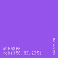 Цвет #9653EB в цветовой модели RGB обозначается тремя октетами (150, 83, 235) в десятичном формате и #9653EB в шестнадцатиричном (hex) формате, которые являются интенсивностью красного 150 (hex 96), интенсивность зелёного 83 (hex 53) и интенсивность синего 235 (hex EB).