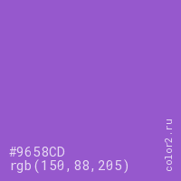 Цвет #9658CD в цветовой модели RGB обозначается тремя октетами (150, 88, 205) в десятичном формате и #9658CD в шестнадцатиричном (hex) формате, которые являются интенсивностью красного 150 (hex 96), интенсивность зелёного 88 (hex 58) и интенсивность синего 205 (hex CD).