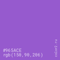 Цвет #965ACE в цветовой модели RGB обозначается тремя октетами (150, 90, 206) в десятичном формате и #965ACE в шестнадцатиричном (hex) формате, которые являются интенсивностью красного 150 (hex 96), интенсивность зелёного 90 (hex 5A) и интенсивность синего 206 (hex CE).